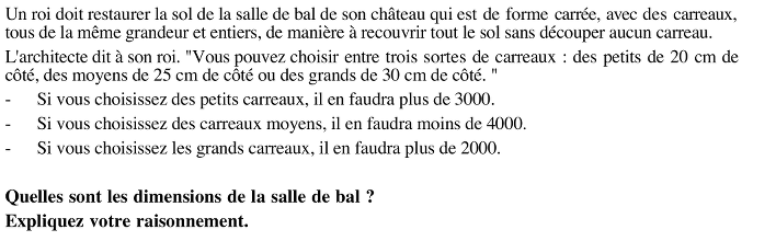 Déterminer les dimensions d'un carré pouvant être recouvert par plus de 3000 petits carreaux (20 x 20 cm), par moins de moyens carreaux (25 x 25 cm) et plus de 2000 grands carreaux (30 x 30 cm).