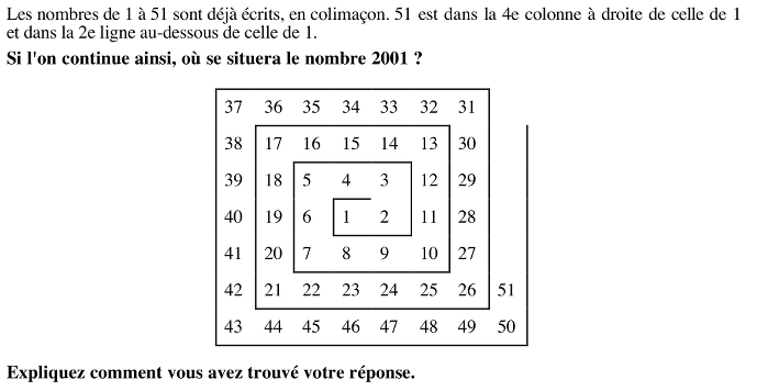 Placer le 2001e terme de la suite des nombres entiers, dont les 51 premiers sont donnés, placés dans une sprirale quadrangulaire.