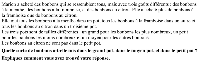 - Se rendre compte que le petit pot ne peut contenir les bonbons à la framboise (puisqu'il y en a plus que de bonbons au citron), ni les bonbons au citron (qui ne sont pas dans le petit pot) et donc il doit nécessairement contenir les bonbons à la menthe.