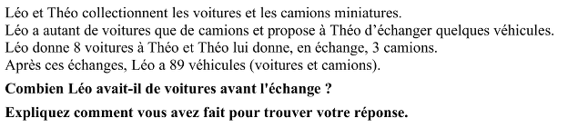 Déduire que 78 = 89 – 11 est le double du nombre des automobiles de Léo après l'échange. Conclure donc que le nombre initial des automobiles de Léo était 47 = (78 : 2) + 8.