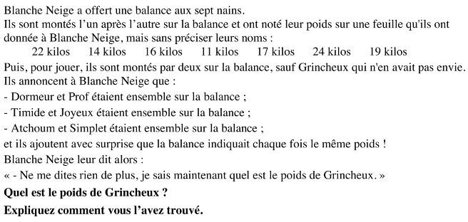 Ou, (solution peu probable à ce niveau), ajouter tous les poids (résultat 123 kg), remarquer que ce nombre est divisible par 3 et qu’en enlevant de ce total le poids de Grincheux il faut obtenir un résultat lui aussi divisible par 3. Le poids de Grincheux doit donc être divisible par 3, ce qui n'est le cas que pour le nombre 24.