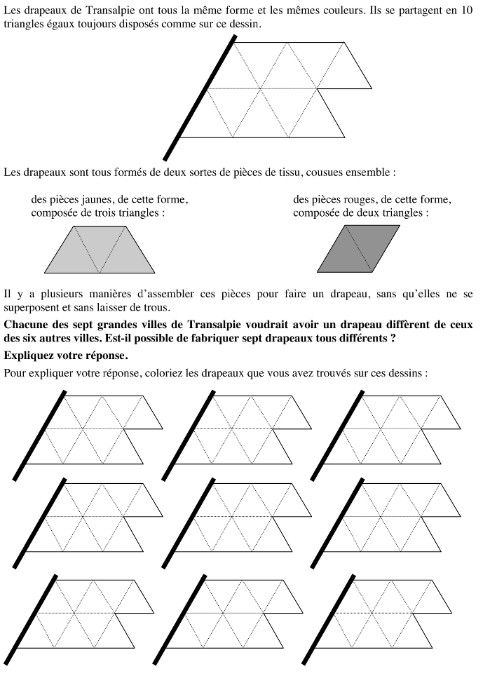 - Comprendre qu'on peut éliminer le cas de trois pièces de 3 triangles car il ne resterait qu’un triangle, puis éliminer le cas d’une pièce de 3 car il resterait sept triangles, puis éliminer encore le cas où il n’y a pas de pièces de 3 car le dessin du drapeau empêche le pavage en cinq pièces de 2.