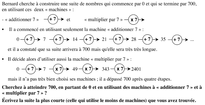 Ou : trouver une solution en douze opérations +7, x 7, +7, +7, +7, +7 +7, +7, +7, x 7 +7,+7 ou en dix-sept opérations (quatorze additions, une multiplication et deux additions)
