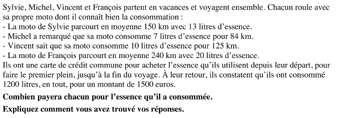 Partager des frais de 1500 euros pour l'achat de 1200 litres d'essence consommés de concert par trois amis sur des motos dont les consommations varient (13 litres pour 150 km, resp. 7 litres pour 84 km, 20 litres pour 240 km).