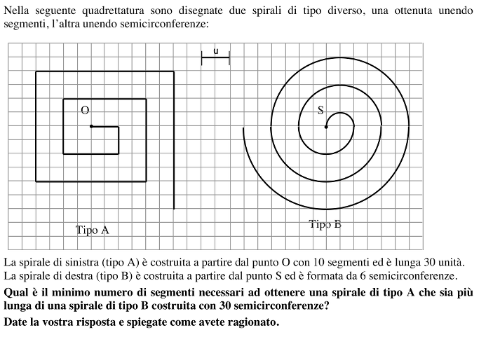 Dati due tipi di spirale di cui una rettangolare, composta da segmenti consecutivi e una circolare, formata da semicerchi consecutivi, determinare il numero minimo di segmenti necessari per formare una spirale rettangolare che sia più lunga di una spirale circolare composta da 30 semicirconferenze.