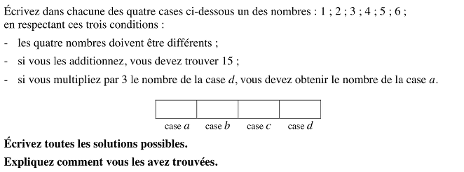 La condition du « triple » ne donne que deux possibilités pour le premier et le dernier nombre : 3 et 1 ou 6 et 2 ; par essais successifs ou en tenant compte de la somme « 15 », les élèves peuvent arriver aux solutions 3651 et 3561 dans le premier cas, 6432 ou 6342 dans le deuxième cas.