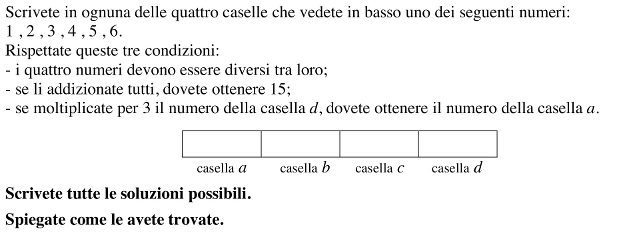 Trovare quattro numeri diversi tra 1; 2; 3; 4; 5; 6 la cui somma sia 15 e in cui il quarto sia triplo del primo.
