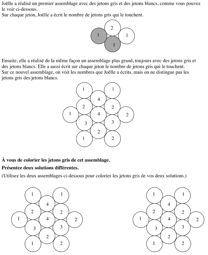 Déterminer les jetons gris d'un assemblage de jetons pour le que nombre de jetons gris touchant un jeton corresponde à la quantité indiquée sur celui-ci.