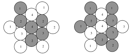 Ou : voir que certains jetons ont des couleurs imposées : le 2 tout à droite impose les 2 et 3 qui le touchent en gris, puis le 2 en bas à droite impose le 2 en bas de la colonne du milieu en gris, puis le 1 en bas à gauche impose le 3 à gauche en blanc et le 1 tout à gauche impose le 2 à gauche en gris, enfin le 4 central, déjà entouré de quatre gris, impose le 4 supérieur en blanc. Ainsi, la couleur des six jetons qui entourent le 4 central est imposée.