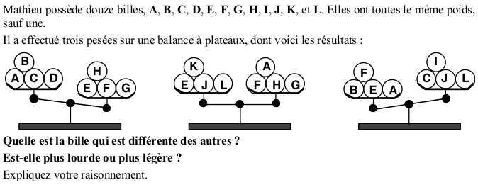 Déterminer la billes d'un poids différent de 11 autres de même poids à partir des informations données par trois pesées réalisées avec une balance à deux plateaux.