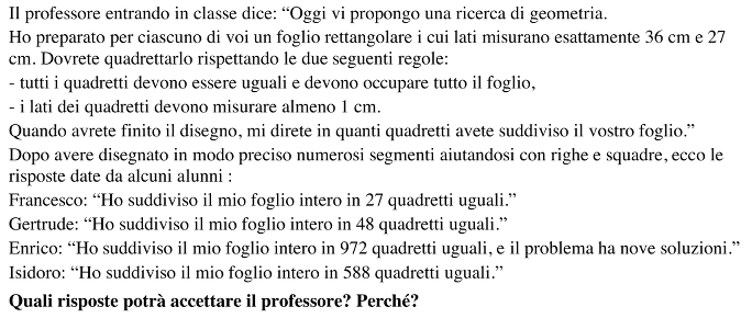 Questo problema Quadrettatura si ispira al problema Quadrettatura del 10° RMT nel quale si chiedeva se fosse possibile ritagliare un rettangolo 120 x 225 in 480 quadrati identici e, in caso affermativo, di dare la misura dei lati di tali quadrati. La maggior parte degli elaborati esaminati presentava il calcolo dell’area di uno di questi quadrati, 56,25, trovata tramite una divisione per 480. Una parte delle risposte diceva che non era possibile in quanto 56,25 non era un numero intero, un’altra parte dava 7,5 con il calcolo, con la calcolatrice della radice quadrata di 56,25, ma nessun elaborato prendeva in conto i vincoli geometrici, cioè non verificava l’esistenza di un numero intero di quadrati di 7,5 di lato sulla lunghezza e la larghezza del rettangolo.