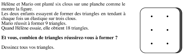 - Former les triangles de manière organisée : d'un clou d'une colonne choisir à chaque fois deux des trois clous de l'autre colonne, ce qui conduit à 3 x 3 = 9 triangles, et réciproquement reproduire la même procédure à partir de l'autre colonne, ce qui conduit à un total de 18 triangles;