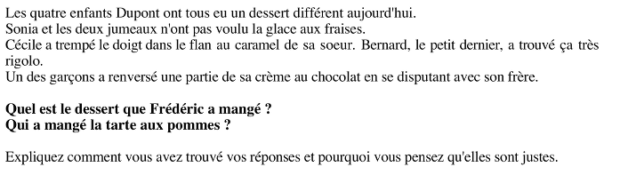 - Rédiger l'explication et la justification par des phrases du genre : "Bernard est le petit dernier, ce n'est donc pas un des jumeaux, c'est lui qui a mangé la glace au fraises et c'est l'autre garçon, Frédéric qui a mangé la crème au chocolat, ...";