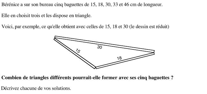Déterminer combien de triangles on peut former en utilisant 3 baguettes parmi les 5 de longueurs 15, 18, 30, 33 et 46 cm.