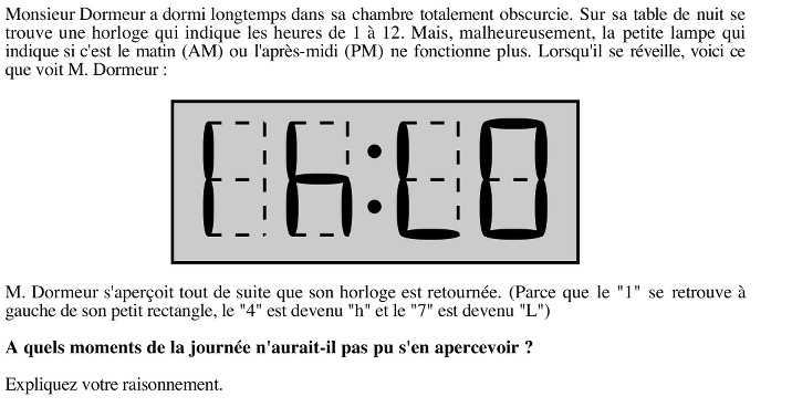 - le combinaisons 02:20 - 02:50 - 05:20 - 05:50 (et éventuellement le 00:00, même si l'énoncé parle des heures de 1 à 12) sont les seules qui sont lisibles lorsque l'horloge est retournée.
