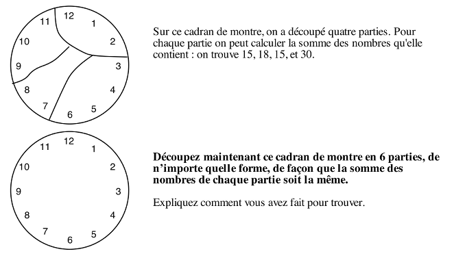 Découper le cadran d'une montre en 6 parties de façon que la somme des nombres de chaque partie soit la même.