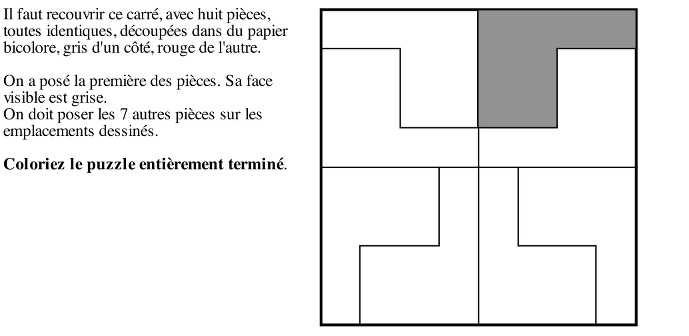 Colorier les huit pièces identiques découpées dans du papier bicolore, gris d'un côté, rouge de l'autre qui recouvrent un carré.