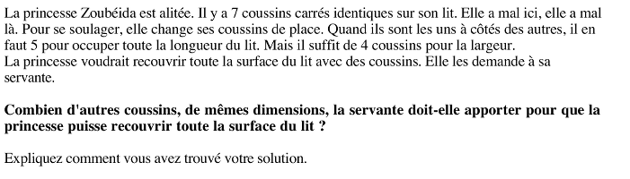 - Se représenter la surface du lit (rectangle) et un "pavage" par coussins;