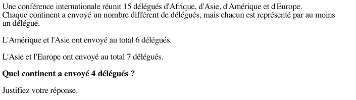 Déterminer l'ensemble contenant 4 éléments (délégués) parmi 4 ensembles (Afrique, Asie, Amérique, Europe) dont on connaît le nombre total d'éléments (15) et le nombre d'éléments contenu dans Amérique et Asie (6) et Asie et Europe (7).