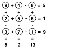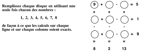Remplir un tableau 3 x 3 par les nombres de 1 à 9 de telle manière que les calculs, évoqués par les signes + ou - entre les cases, effectués en ligne et en colonne donnent les résultats proposés.