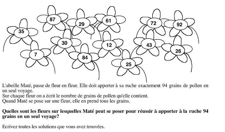 Parmi les nombres 35, 87, 29, 61, 72, 92, 7, 30, 84, 12, 25, 43, 26 trouver les familles dont la somme vaut 94.