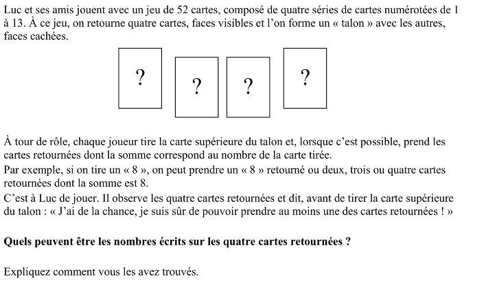 - Se rendre compte que le 1 et le 2 devront nécessairement faire partie des quatre nombres (ils ne peuvent être obtenus comme somme des autres) et que les nombres trop élevés comme 12 et 13 doivent être exclus.