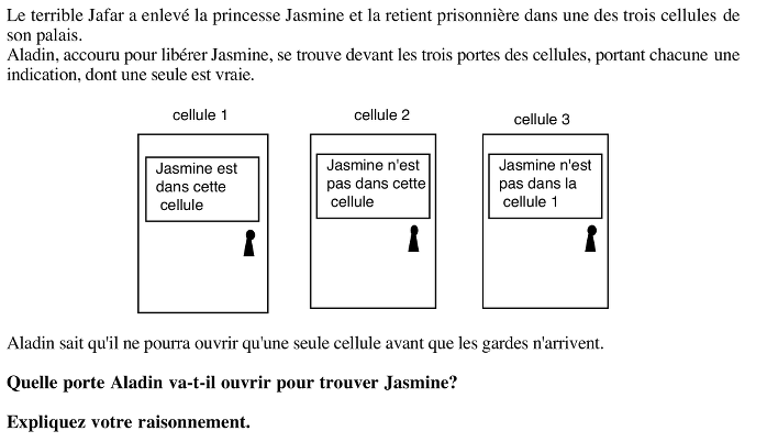- Vérifier que, si Jasmine est dans la cellule 2, seule l'indication 3 est vraie et en conclure que c'est la porte 2 qu'Aladin doit ouvrir ou constater que les indications 1 et 3 sont la négation l'une de l'autre et que l'une des deux doit être vraie et que, par conséquent l'indication 2 est certainement fausse et que, par conséquent, Jasmine doit être dans la cellule 2
