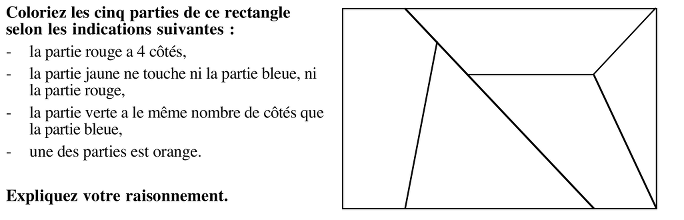 Colorier les cinq parties d'un rectangle avec cinq couleurs en respectant des règles de voisinage.