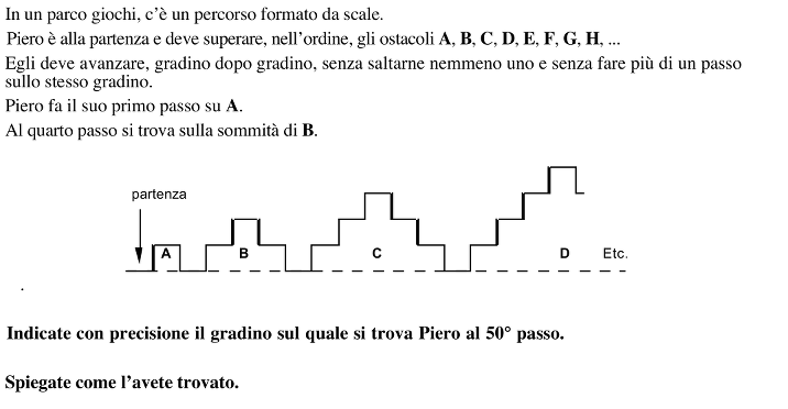 In un percorso ci sono ostacoli che si susseguono, formati rispettivamente da uno scalino (un passo per salire e uno per scendere), due scalini (2 passi per salire e due per scendere)), 3 scalini (3 passi per salire e tre per scendere). Determinare la posizione di un corridore quando fa il suo 50ยบ passo.