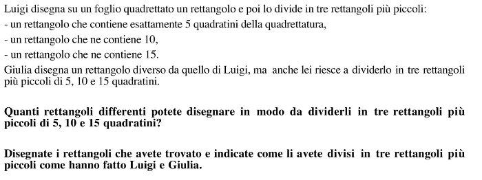 Disegnare su una quadrettatura tutti i rettangoli, che possono essere divisi in tre rettangoli più piccoli composti da 5, 10 e 15 quadretti della quadrettatura.
