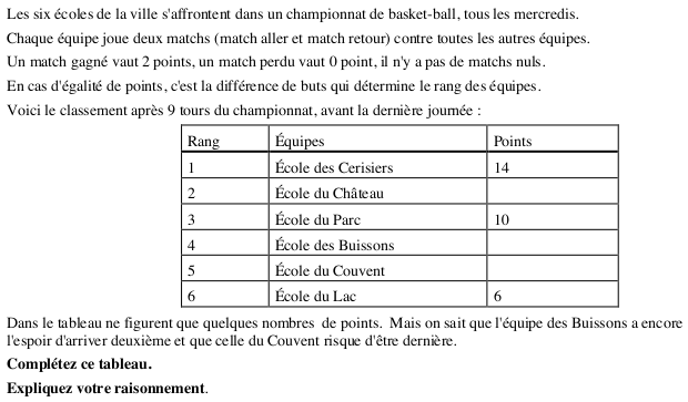 - Comprendre qu'il y a 30 parties en tout (6 x 5), que 27 parties ont été jouées avant la dernière journée, que la somme des points du tableau doit par conséquent être 54, que les trois équipes du Parc, des Cerisiers et du Lac en ayant déjà 30 (14 + 10 + 6), il reste 24 points à se partager pour les trois écoles du Château, des Buissons et du Couvent.