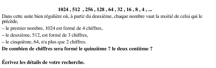 Trouver le nombre de chiffres constituant le quinzième et le deux centième nombre de la progression géométrique de premier terme 1024 et de raison 1/2.