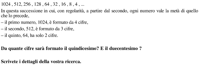 Trovare il numero delle cifre che formano il quindicesimo e il duecentesimo numero di una progressione geometrica che ha ragione 1/2 e primo termine 1024.