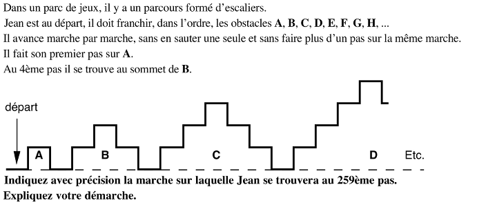 - Comprendre qu’après avoir surmonté les 15 premiers escaliers, Jean a fait 240 pas, en déduire qu’il doit encore faire 19 pas sur le 16e escalier pour arriver à un total de 259 pas.