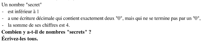 Trouver tous les nombres décimaux inférieurs à 1, dont l'écriture contient exactement deux '0', qui ne se terminent pas par '0' et dont la somme des chiffres vaut 4.