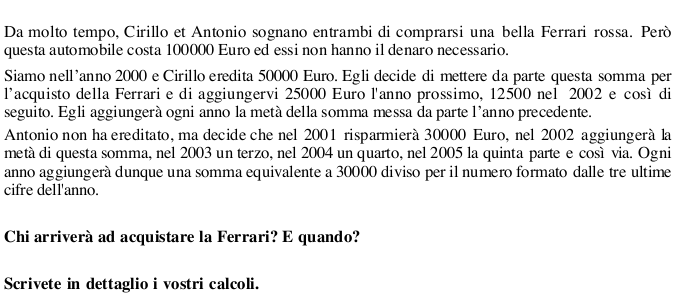 Il 1° gennaio 2005 Cirillo ha compiuto gli anni e ha ricevuto come mancia 50 euro. Da tempo desidera acquistare il modellino della Ferrari che costa 100 euro; pertanto decide di mettere da parte questa somma per l’acquisto dell’auto dei suoi sogni e di aggiungervi 25 euro l'anno successivo, 12,50 nel 2007 e così di seguito.