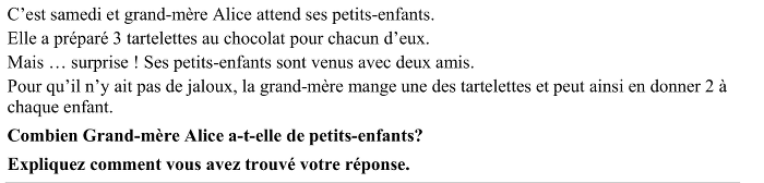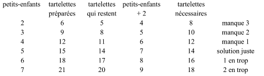 - Ou, comprendre que la grand-mère retire une tartelette à chacun de ses petits-enfants et donc que le nombre qu’elle distribue aux deux autres enfants plus celle qui lui reste, soit 5, est égal au nombre de ses petits-enfants.