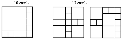 Décomposer un carré formé de 5 x 5 petits carrés en respectivement 10 et 13 carrés en suivant le quadrillage.