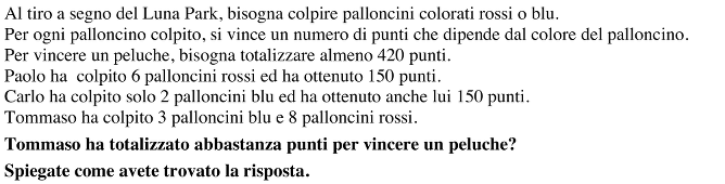 Determinare se il numero di punti ottenuti (al poligono di tiro) per 3 palloncini blu e 8 palloncini rossi è maggiore o uguale a 420, sapendo che 6 palloncini rossi valgono 150 punti così come 2 palloncini blu.