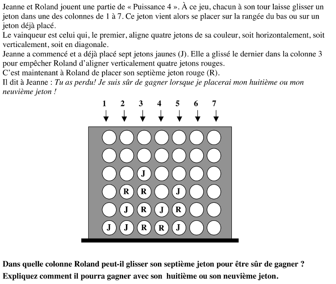 - Si Jeanne place son 8e jeton ailleurs, Roland place le sien dans la colonne 1. Alors si Jeanne place son 9e jeton dans la colonne 1 sur celui de Roland, en 3e ligne pour empêcher l’alignement horizontal, Roland placera son 9e jeton sur celui de Jeanne dans la colonne 1, en 4e ligne, et réalisera l’alignement oblique. Et si Jeanne ne place pas son 9e jeton dans la colonne 1 sur celui de Roland alors celui-ci peut placer son neuvième jeton dans la colonne 1 et réaliser l’alignement horizontal.