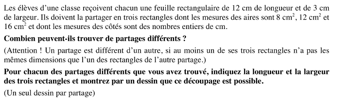 (pour chacun des partages dessinés ci-dessus, il y a quatre dispositions des trois rectangles, égales à une symétrie axiale ou centrale près ; selon la consigne, il ne faut en choisir qu’une seule).