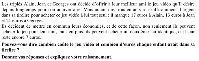 Ou: en langage naturel, si chaque triplé veut acheter un jeu, il manque 51 euros (17 + 13 + 21), alors que s'ils n'achètent que deux jeux, il reste 7 euros. Donc un jeu coûte 58 euros (51 + 7).