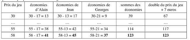 - Faire l’hypothèse d’un prix supérieur à 21 euros (par exemple 30 euros), puis procéder à des ajustements ultérieurs de cette valeur pour obtenir l'égalité entre la somme totale des économies et le double du prix du jeu augmenté de 7 ; par exemple par un tableau de ce genre :