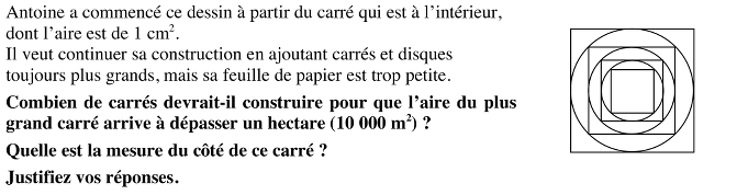 On inscrit un carré de 1 cm de côté dans un disque, lui-même inscrit dans un carré, etc. Trouver le nombre de carrés à construire pour que l'aire du dernier arrive à dépasser 1 ha.