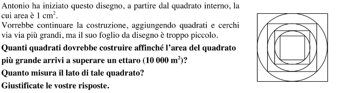 Si inscrive un quadrato di 1 cm di lato in un cerchio che a sua volta è inscritto in un quadrato, etc. Trovare il numero di quadrati da costruire affinché l’area dell’ultimo quadrato sia maggiore di 1 ha.