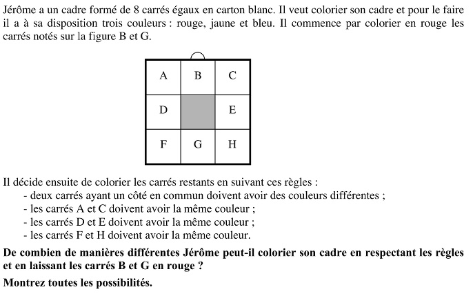 - Se rendre compte que Jérôme doit colorier les carrés A, C et F, H en jaune ou en bleu, ayant déjà colorié en rouge les carrés B et G. Se rendre aussi compte que l'on peut obtenir des cadres à 2 couleurs et des cadres à 3 couleurs.
