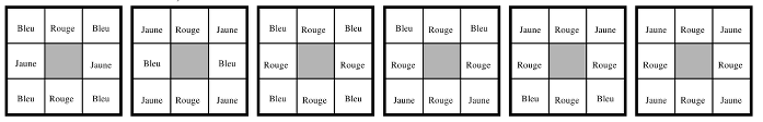 - En déduire que Jérôme a 6 possibilités différentes pour colorier ses carrés, en respectant la première condition :