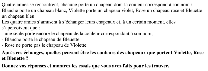 Une correspondance entre quatre amies et couleur de leur chapeau est donnée. Etablir les nouvelles correspondances après un échange sur le base de trois assertions.