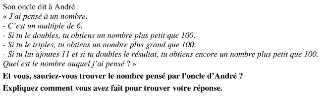 - Se rendre compte que la dernière condition limite l'intervalle précédent et qu'on peut éliminer les nombres de 40 à 49 parce qu’en leur ajoutant 11 on obtient les nombres de 51 à 60, dont les doubles sont plus grands que 100. Il ne reste dans l'intervalle que les nombres 34, 35, 36, 37, 38 et 39 dont un seul, 36, est multiple de 6.