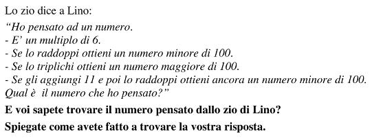 Tradurre la seconda e la terza condizione in operazioni, divisioni o “moltiplicazioni bucate”, a partire da 100; trovare così i due limiti 50 e 33 e concludere che il numero è compreso tra 34 e 49.